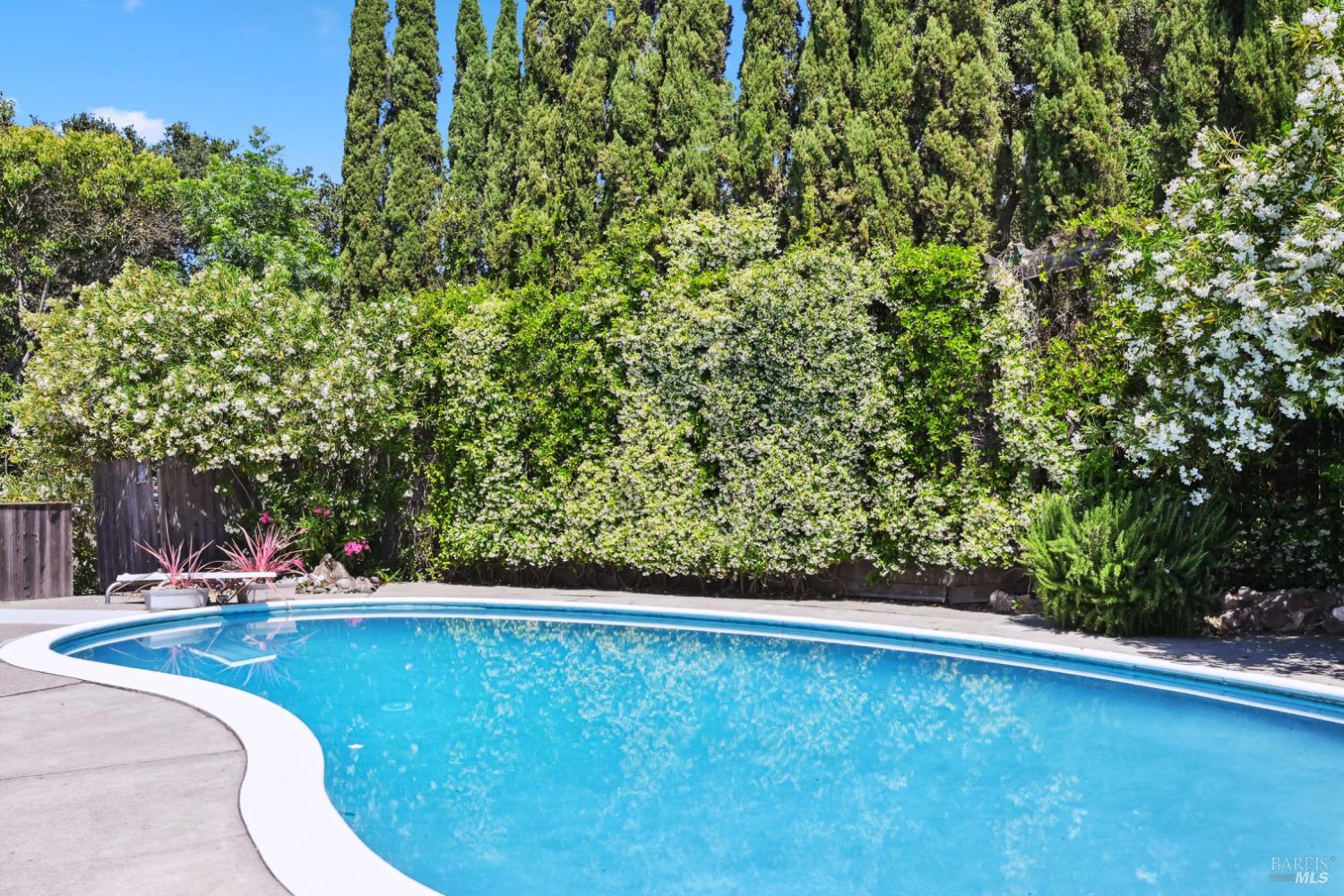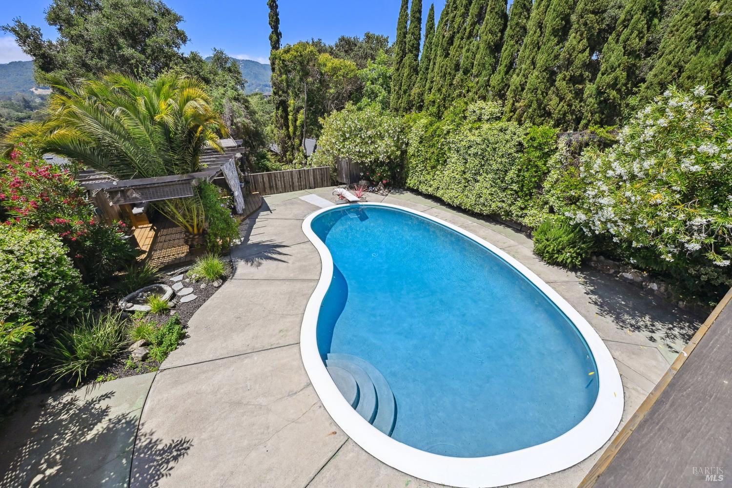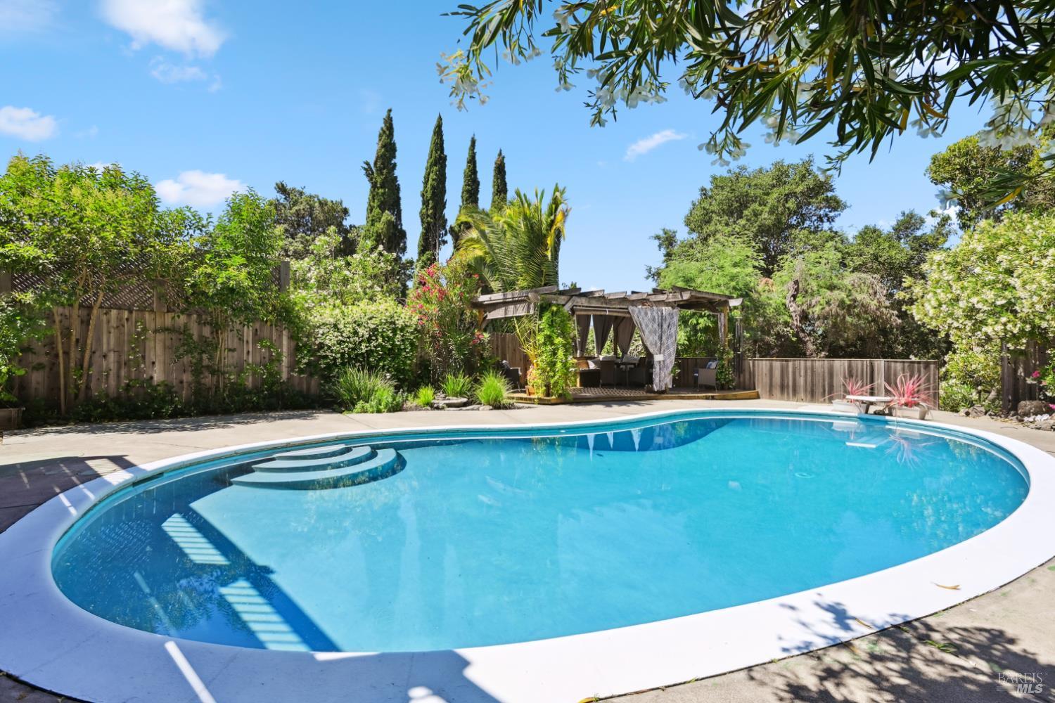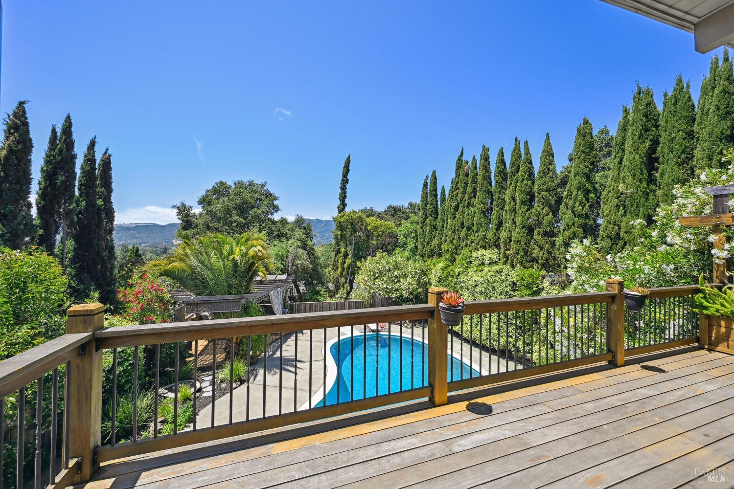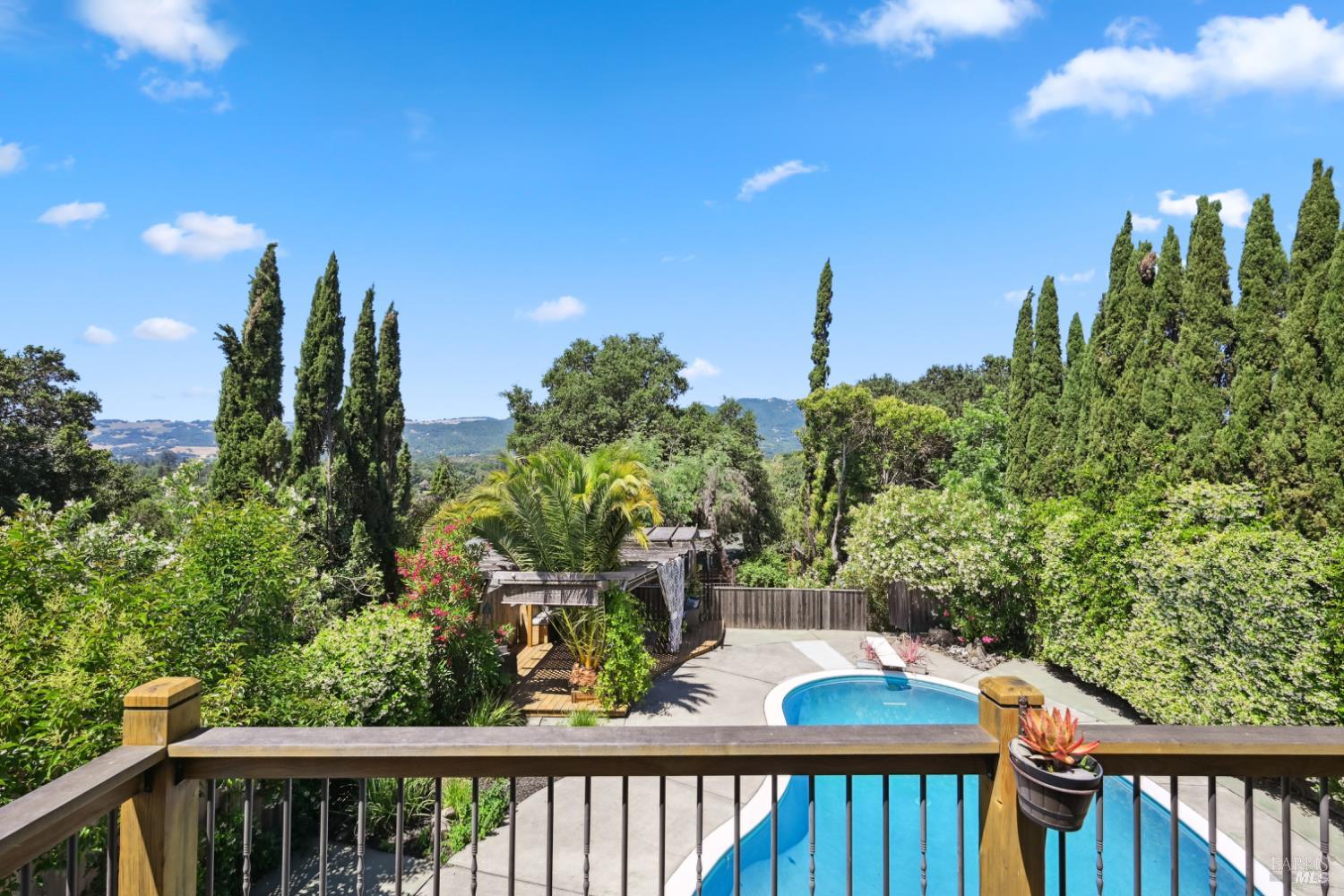 Nestled in the serene landscape of Sonoma's Wine Country, this Mid-Century Modern residence offers privacy and tranquility. French doors open to expansive views of the region's rolling hills, as well as a heated in-ground pool and pergola surrounded by lush greenery, creating a private retreat or al fresco dining experience. Ideally situated on a spacious lot, this Eichler-inspired design has abundant natural light throughout. Flexibility and income-generating possibilities: this 3BD/2BA 1,281 sq ft home can be used as a 4BD/3BA 1,581 sq ft home via the attached guesthouse, accessible either from the main home by a secret bookcase or via the guesthouse private entrance. The property is currently generating income utilizing a hosted vacation rental permit; buyer to pursue. A weekend getaway or full-time residence, this exciting and meticulously maintained home is less than ten minutes to the historic Sonoma Plaza.