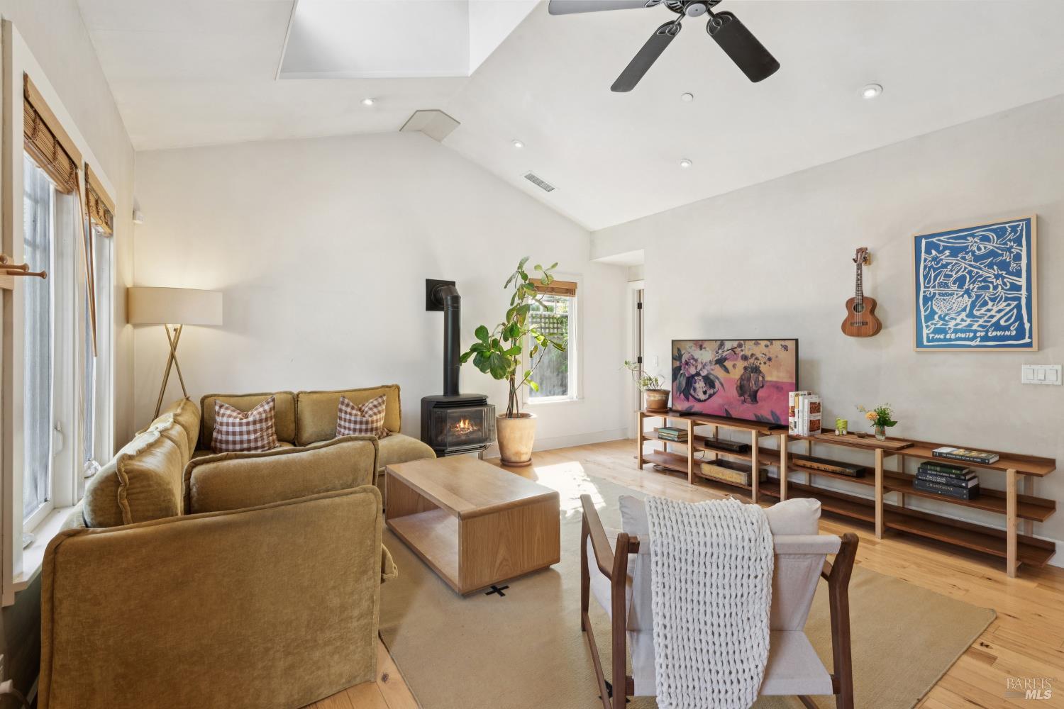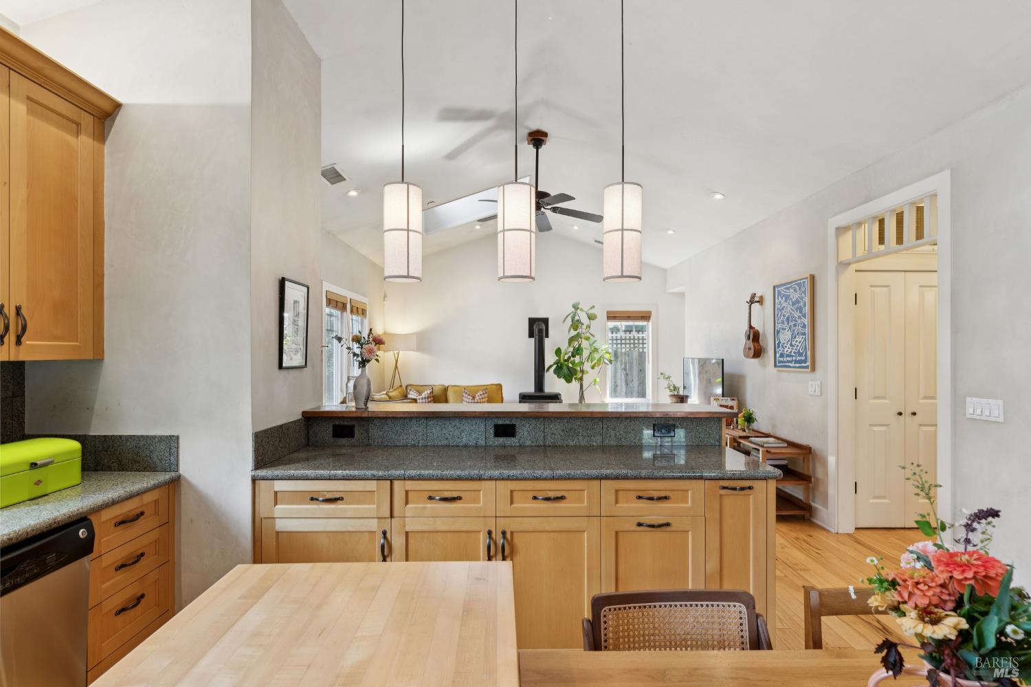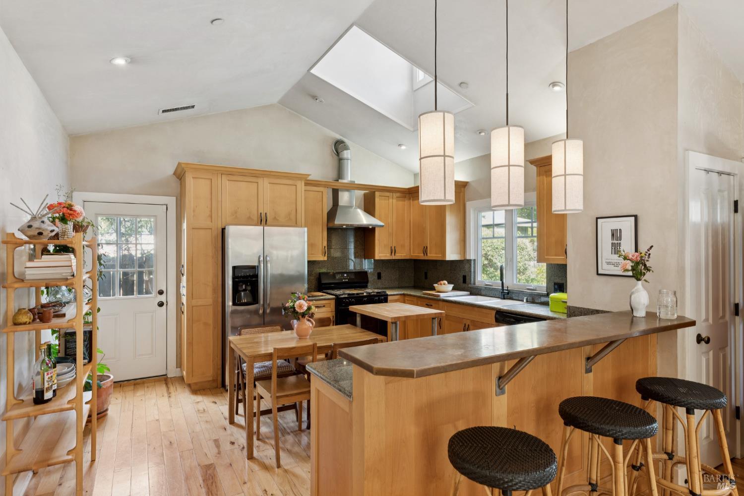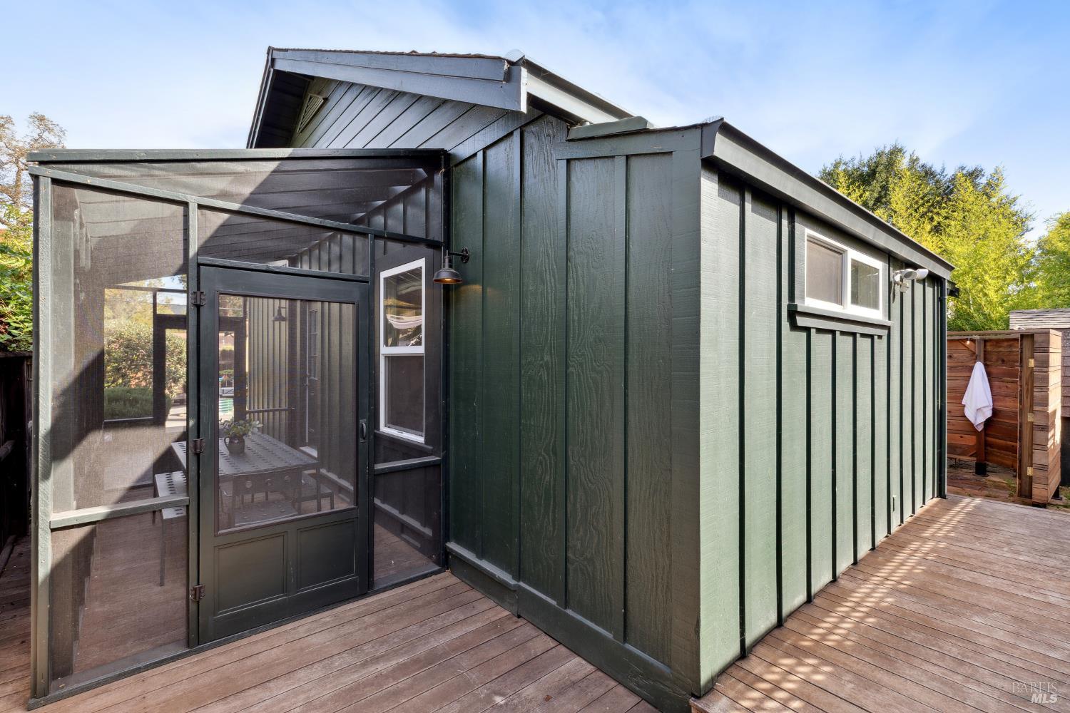 Located in the heart of Sonoma Valley, this 2BD/1BA single-level custom-built home offers 851 sq ft of living space with modern comforts in a private and tranquil setting. Thoughtfully constructed in 2006, this home boasts of high-end finishes including a copper breakfast bar top, Venetian plaster walls, Hickory hardwood floors, Alderwood cabinets, granite counters, stainless steel appliances, heated tile bathroom floor, central A/C, tankless water heater, and solar. A detached converted garage serves as an additional 400 sq ft of living space with ample storage yet can be easily returned to car storage. Among professional landscaping, a newly constructed screened-in patio provides additional space for al fresco dining and entertaining. Whether looking for a weekend escape or a full-time residence in the heart of Wine Country, this timeless bungalow is ready to welcome you home.